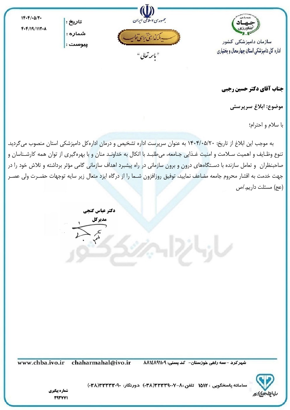 دکتر حسین رجبی به عنوان سرپرست اداره تشخیص و درمان اداره کل دامپزشکی استان چهارمحال و بختیاری منصوب شد