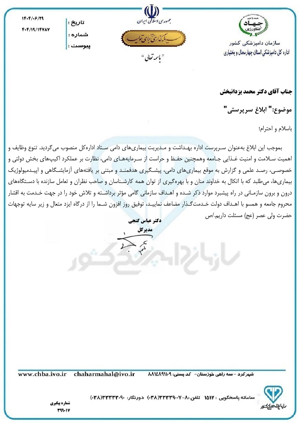 دکترمحمد یزدان بخش به عنوان سرپرست اداره بهداشت و مدیریت بیماریهای دامی منصوب شد